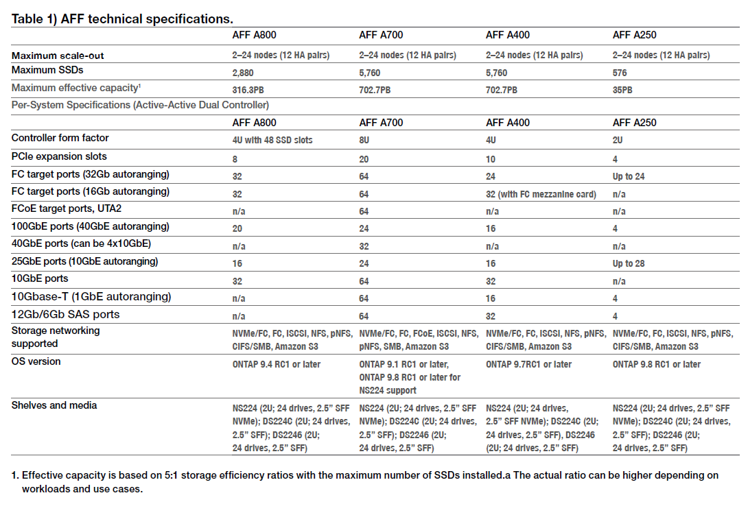 p>• Consolidate workloads on AFF systems, which can deliver up to 11.4 million IOPS at 1ms latency in a cluster with a truly unified scaleout architecture. You also get built-in adaptive quality of service (QoS) that safeguards SLAs in multiworkload and multitenant environments.• Manage massively scalable NAS containers of up to 20PB and 400 billion files with a single namespace.