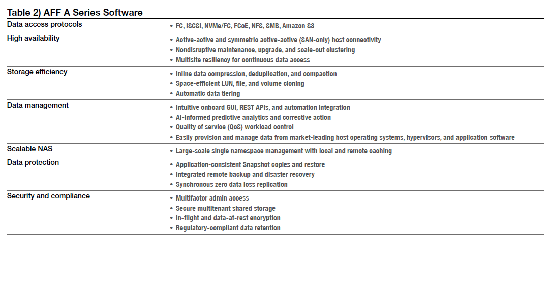 AFF A-Series systems, from entry-level to highend, support end-to-end NVMe technologies, from NVMe-attached SSDs to front-end NVMe over Fibre Channel (NVMe/FC) host connectivity. These systems deliver the industry’s lowest latency for an enterprise all-flash array, making them a superior choice for driving the most demanding workloads and AI/DL applications. With a simple software upgrade to the modern NVMe/FC SAN infrastructure, you can drive more workloads with faster response times, without disruption or data migration.