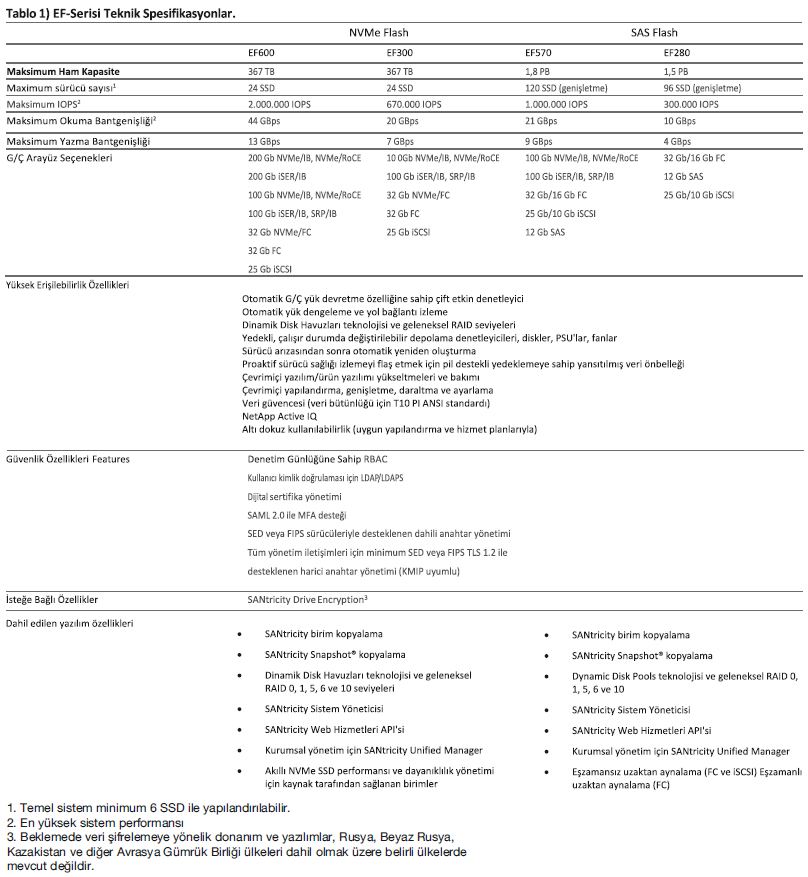 EF300 ve EF280 sistemleri ise büyük veri analitiği ve veritabanları gibi karma iş yükü ortamları için tasarlanmıştır. NVMe all-flash sistemleri, SAS all-flash sistemlerinin performansını iki katına çıkarır ve yüksek performanslı iş yükleri için özel olarak tasarlanmış uçtan uca bir NVMe sistemiyle yazma IOPS ve okuma/yazma çıkış gücünü hızlandırabilirsiniz.